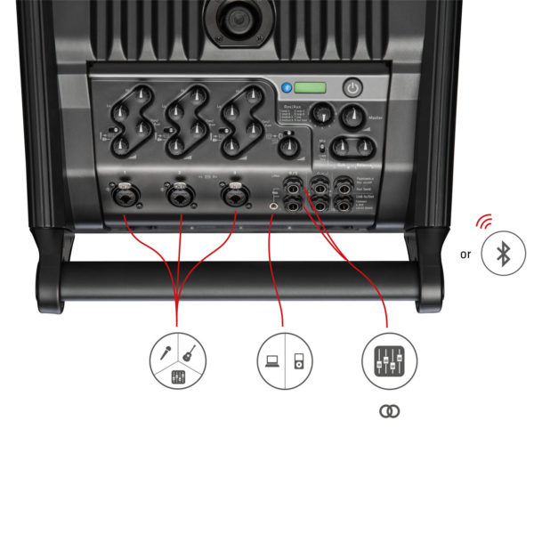 • Zintegrowany 5-kanałowy mikser (3 x combo Jack1/4 ″(6,3 mm) / XLR, 2 gniazda jack 1/4 ″ (6,3 mm) / mini jack stereo, wejście Bluetooth, wejście Link In)