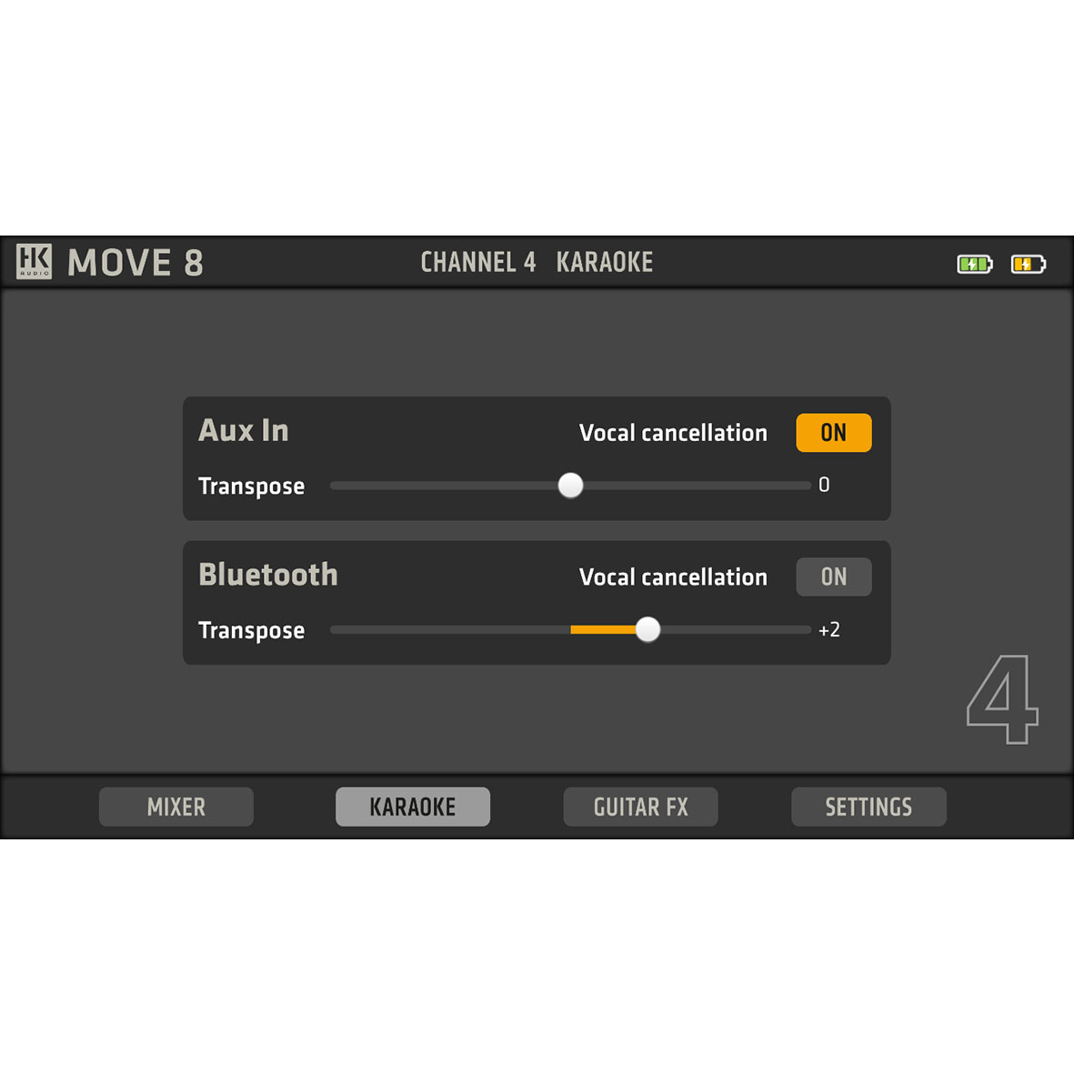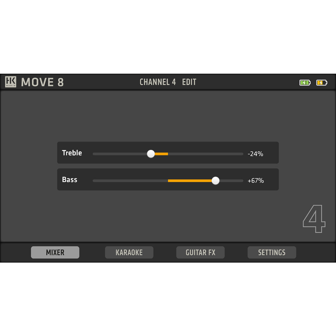 | Equalizer | 2-band EQ dla kanałów 1–3 (kanał 4 poprzez aplikację) |
