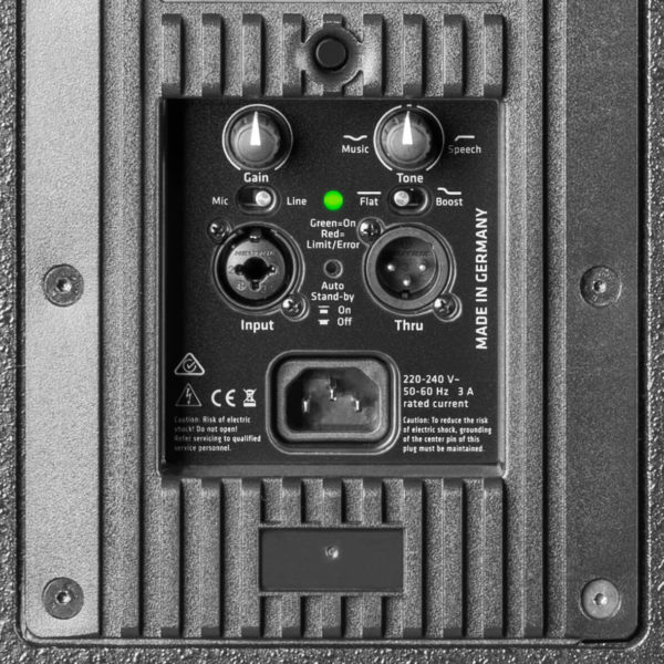 Aktywna kolumna szerokopasmowa 12″/1″ (samodzielna, satelita lub monitor sceniczny) o mocy 1200 W (bi-amp klasy D), max. SPL 132 dB, gwizdek 90° x 55°, wejście 1 x XLR/TRS combo symetryczne, wyjście 1 x XLR Thru, limiter szczytowy i RMS, regulacja barwy (muzyka/mowa), preset Bass Boost, zwrotnica z filtrem FIR
